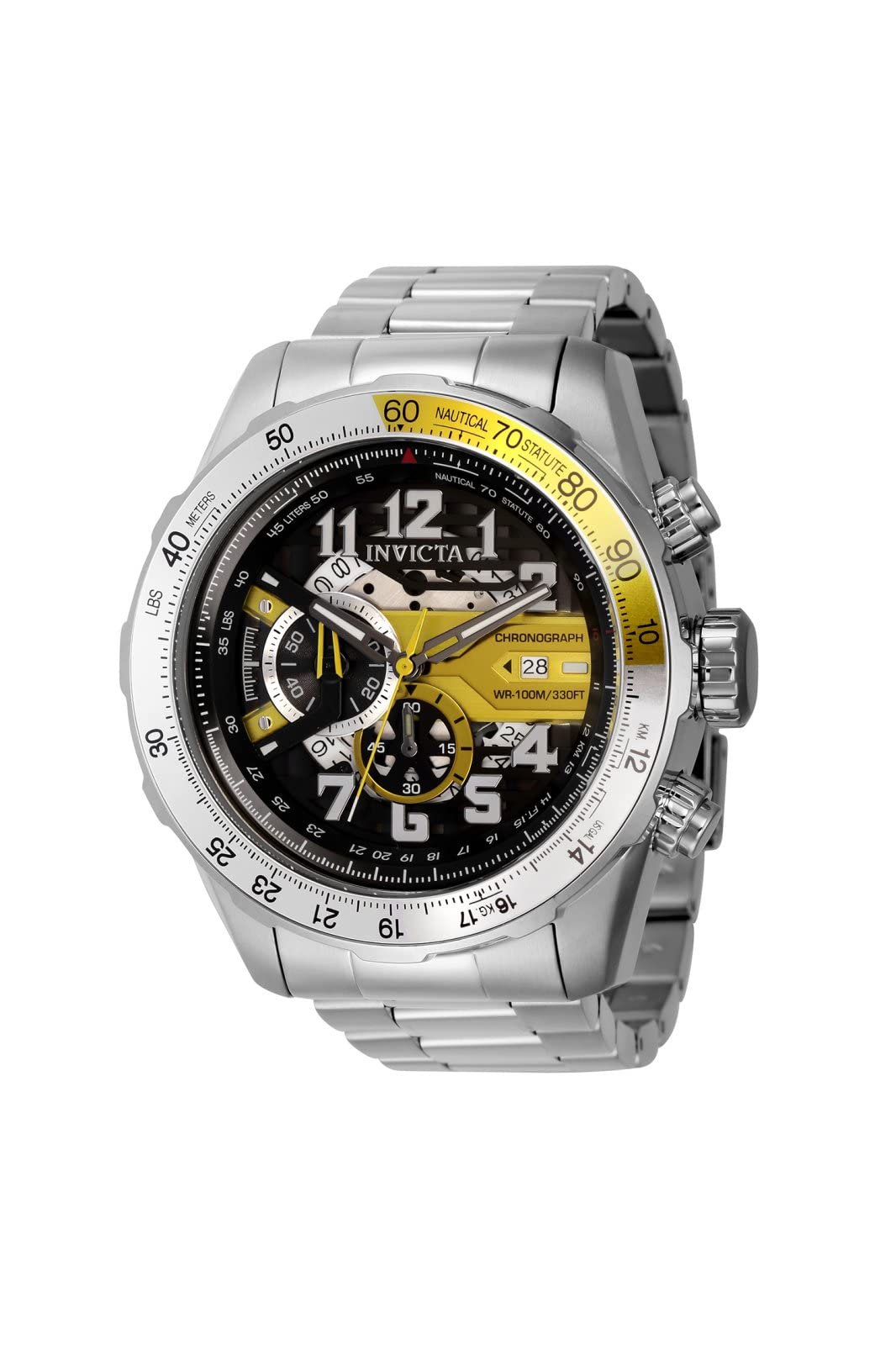 Your Invicta Aviator Chronograph Watch Model 36674 comes packaged in a distinctive yellow and black box, designed to protect your timepiece during transit and provide a secure storage solution.