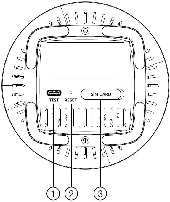 This diagram illustrates the bottom panel of the router, highlighting the TEST port, RESET button, and SIM CARD slot.